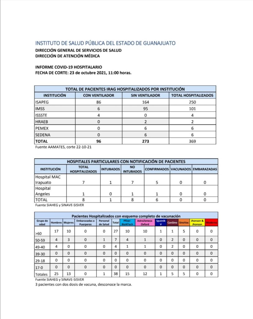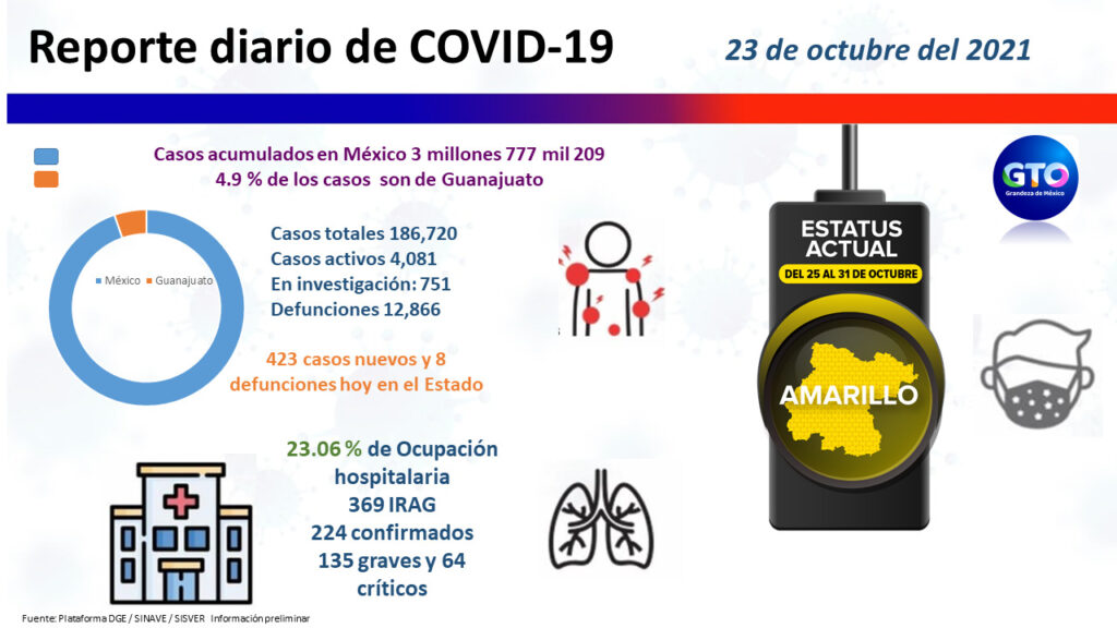 Con el semáforo en amarillo hasta el próximo 31 de octubre, la entidad mantiene en atención hospitalaria a 224 guanajuatenses, de los cuales 135 permanecen en estado de gravedad, 25 estables y 64 en estado crítico (intubados).
