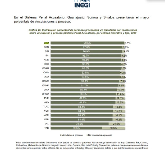 De acuerdo al documento, Guanajuato, Sonora y Sinaloa presentaron el mayor porcentaje de vinculados a proceso con 99.5%, 97% y 96.9%, respectivamente.
