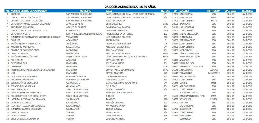 Este fin de semana llegarán al menos 570 mil dosis de la vacuna contra el coronavirus de AstraZeneca para 20 municipios de Guanajuato donde se aplicó la primera dosis a guanajuatenses de entre 18 y 39 años de edad.