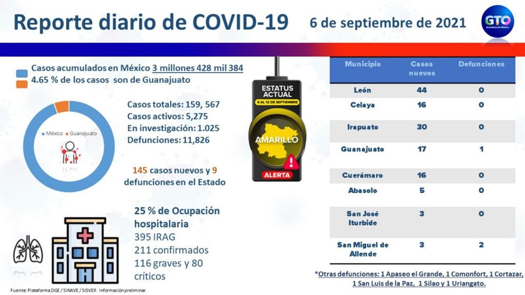 Con esta información, se obtiene un acumulado de 159 mil 567 casos confirmados desde que fue detectado el primero en el estado de Guanajuato.