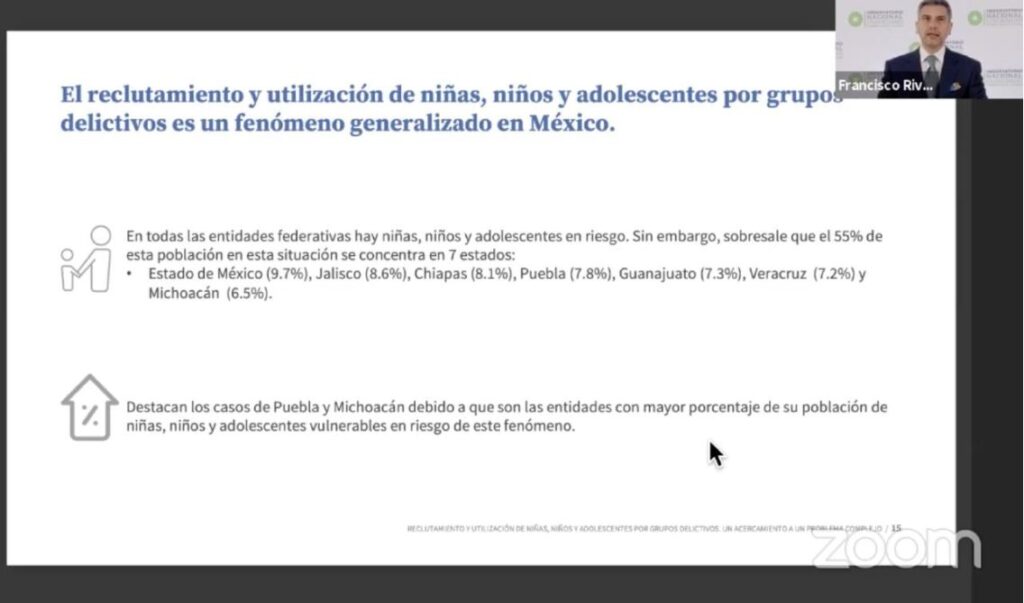 De acuerdo al análisis, el 55% del fenómeno se concentra en siete estados: Estado de México 9.7%, Jalisco 8.6%, Chiapas 8.1%, Puebla 7.8%, Guanajuato 7.3%; Veracruz 7.2% y Michoacán 6.5%.Tania Ramírez Hernández, directora de Redim, aseguró que han documentado y denunciado la forma en que los grupos delictivos se aprovechan de la vulnerabilidad social que impera en las poblaciones, en particular de los infantes y adolescentes para reclutarlos.“En el caso de Guanajuato es uno de los siete estados que sobresalen en el estudio, lo marcamos así como las entidades que tienen mayor cantidad de niñas, niños, adolescentes en riesgo, 7.3% es el dato que corresponde, y por supuesto que hay que observarlo de mano con incremento de la actividad delincuencial y también con el desarrollo industrial, es un caso complejo el de Guanajuato y ciudades más concretamente como León y otras donde se está viendo la disputa del territorio”, sostuvo.La directora de la Red por los Derechos de la Infancia en México, Tania Ramírez, advirtió que la disputa del territorio no solamente sucede en el mundo adulto.Sostuvo que no es un fenómeno propio de México, sino que también han observado que en toda América Latina, en especial en países como El Salvador, Paraguay y Colombia, se ha demostrado que la respuesta bélica por parte del estado contra los grupos delincuenciales no es una solución para atender las causas sociales del problema.“No existen datos oficiales sobre la cantidad de reclutamiento de niñas, niños y adolescentes en México”.No hay políticas públicas en GuanajuatoEl director del Observatorio Ciudadano, Seguridad, Justicia y Legalidad, Francisco Rivas, indicó que aunque Guanajuato sea un estado en auge económicamente hablando y haya trabajo remunerado, la ausencia de políticas públicas hace que no se tengan respuestas contundentes y colaboración interinstitucional, sumado a la ausencia de la estrategia federal para reducir la violencia.“Evidentemente lo que encontramos en Guanajuato es una descomposición relevante, hay que recordar que al final de la administración de Enrique Peña Nieto se le retira una parte muy importante del apoyo de las fuerzas federales a la entidad, se dejan apenas cincuenta fuerzas federales por turno para cubrir uno de los estados que tienen más ciudades económicamente activas, que tiene vías férreas, que tiene carreteras sumamente relevantes y que tiene aeropuertos, y realmente queda en el abandono la entidad”.Lamentó que esto dio lugar a que pudieran ingresar grupos delictivos de otras zonas como es el caso específico del ‘Cártel Jalisco Nueva Generación’ que entró en una pugna por el territorio con otros grupos delictivos locales como es el ‘Cártel de Santa Rosa de Lima’.Francisco Rivas indicó que esta lucha no fue solo para incursionar en el robo de hidrocarburos, sino para otros temas delictivos.“En ese sentido hay varias comunidades que viven del hidrocarburo, hay comunidades que viven de la extorsión, hay comunidades que viven del narcotráfico y evidentemente es un espacio de oportunidad para que los jóvenes participen en este delito. Lamentamos mucho que hoy sigamos viendo una entidad tan importante y productiva”, advirtió.El especialista señaló que de los grupos jóvenes los de secundaria son los más vulnerables, indicó que los grupos criminales seleccionan sus habilidades y luego los capacitan en actividades como el ‘halconeo’ o en el empaque de drogas, hasta llegar a dirigir grupos, ejecutar personas y extorsionar.“Cuando pensamos cómo darle una salida a los jóvenes, ellos difícilmente tienen una salida. Estos menores terminan en la cárcel, desaparecidos o víctimas de otro delito, solo está la desmovilización y el desarrollo de políticas públicas”.Afirmó que “ser joven y niño en México es un peligro, pues los últimos cinco años han sido los más violentos en el país”, concluyó.MEJZ*