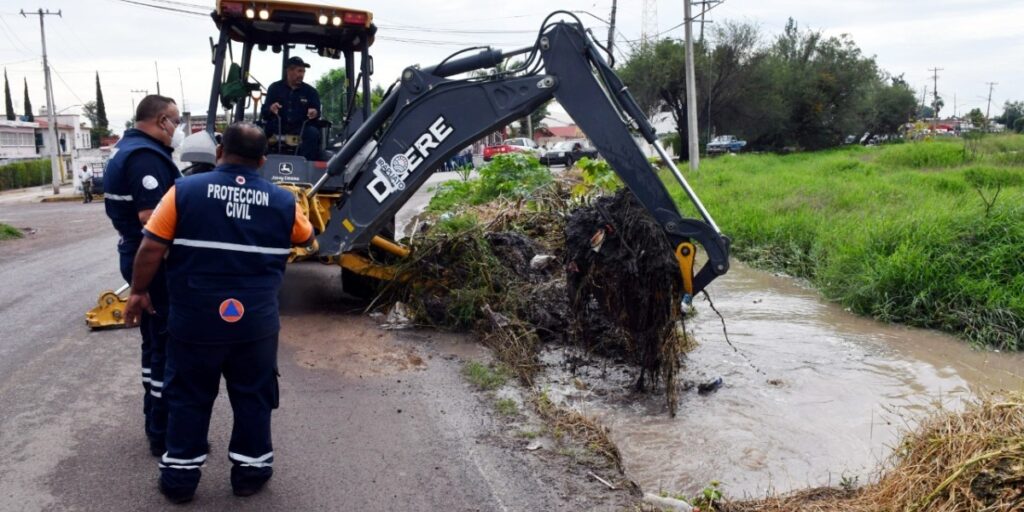 Con maquinaria, equipo y personal operativo, se trabaja desde la madrugada con labores para reforzar los bordos de los drenes y desalojar el agua que alcanzó un tirante de 40 centímetros, en algunas partes de las zonas afectadas.
