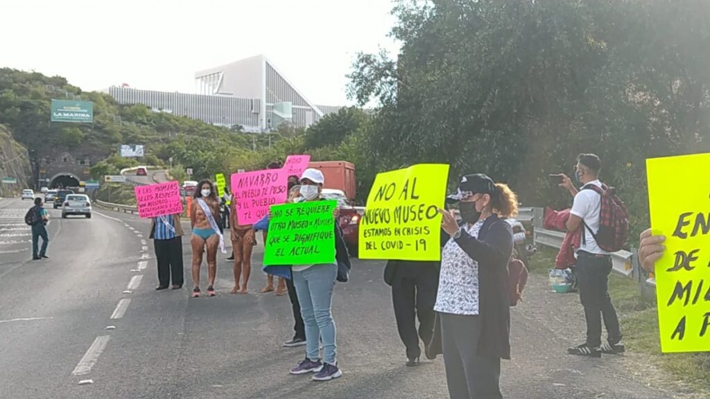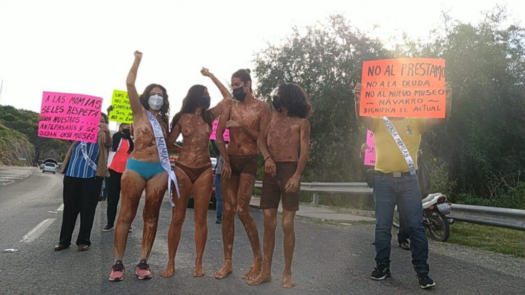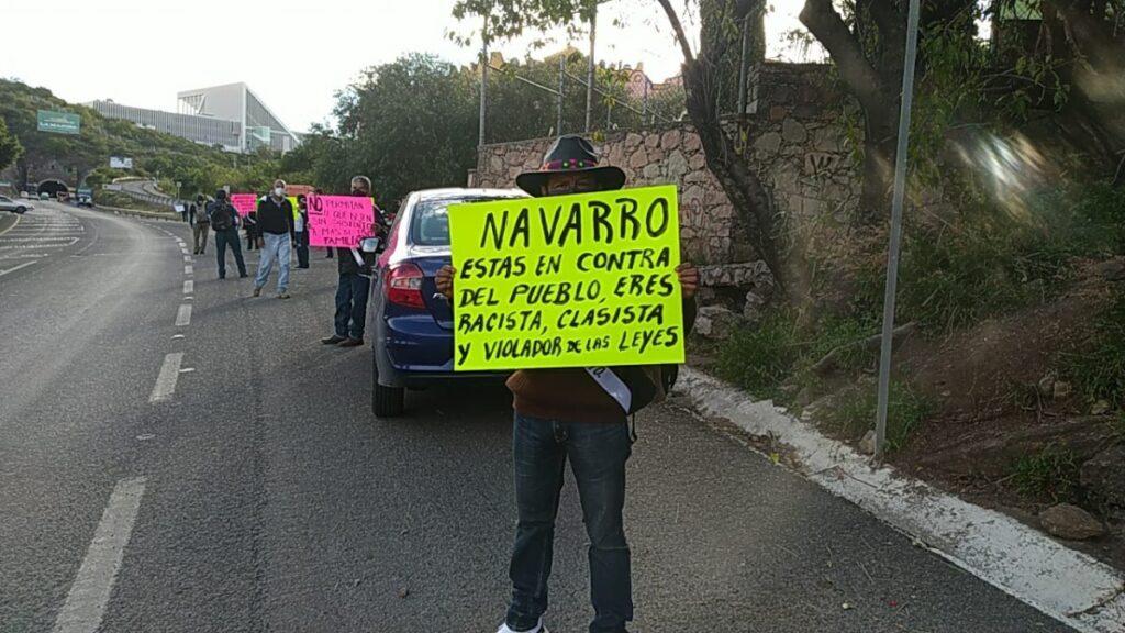 Comerciantes del Museo de las Momias se manifiestan en una de las entradas del Congreso del Estado de Guanajuato, donde se aprobaría la solicitud del financiamiento para la construcción del nuevo museo que tendría un área comercial en su entorno.
