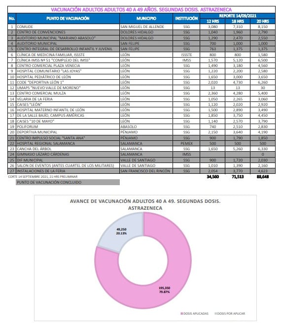 La Secretaría de Salud de Guanajuato (SSG) reportó este martes un avance del 79.8% en la vacunación de personas entre 40 y 49 años, iniciada este lunes en nueve municipios del estado.