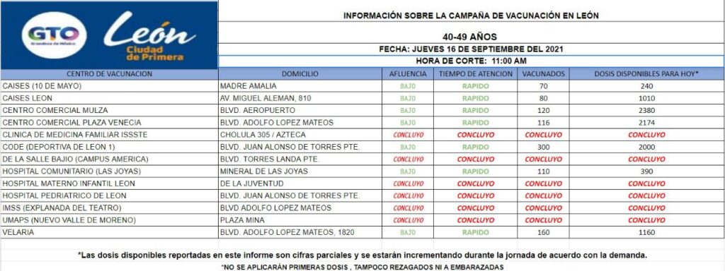 En el caso de León todavía hay vacunas en habilitados los puntos de Plaza Venecia, Centro Comunitario Las Joyas, CODE Deportiva León I, Mulza, Velaria de la Feria, CAISES León y CAISES Diez de Mayo.