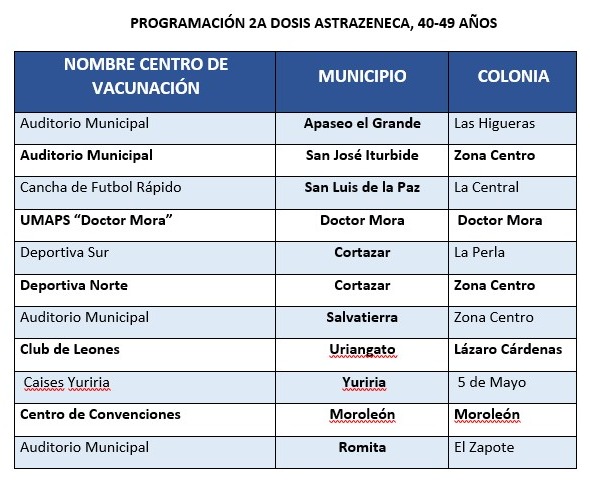 Los ciudadanos de Apaseo el Grande, San José Iturbide, San Luis de la Paz, Doctor Mora, Cortazar, Salvatierra, Uriangato, Yuriria, Moroleón y Romita que tengan entre 40 y 49 años y que además se hayan aplicado la primera dosis de esta farmacéutica, podrán acudir a los módulos de vacunación a partir del próximo lunes.