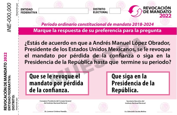 La pregunta que los votantes que acudan a las casillas deberán responder es: ¿Estás de acuerdo en que a Andrés Manuel López Obrador, Presidente de los Estados Unidos Mexicanos, se le revoque el mandato por pérdida de la confianza o siga en la Presidencia de la República hasta que termine su periodo?