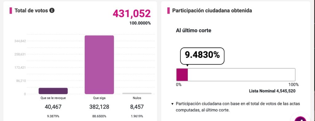 De acuerdo al reporte con corte a las 11:46 de la mañana, en el estado votó el 9.5% de la lista nominal conformada por 4 millones 454 mil 520 personas en la entidad; el 88.65 % votó a favor y el 9.3% en contra.