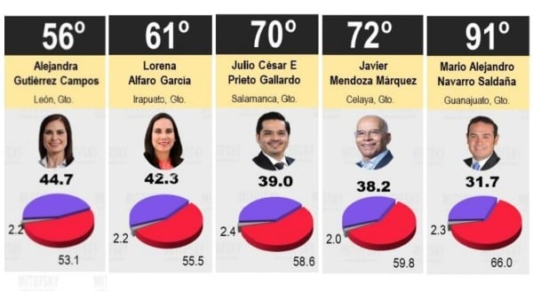 Cinco lugares después, en la posición 61, aparece la irapuatense Lorena Alfaro García, también del PAN, con el 42.3% de aprobación.