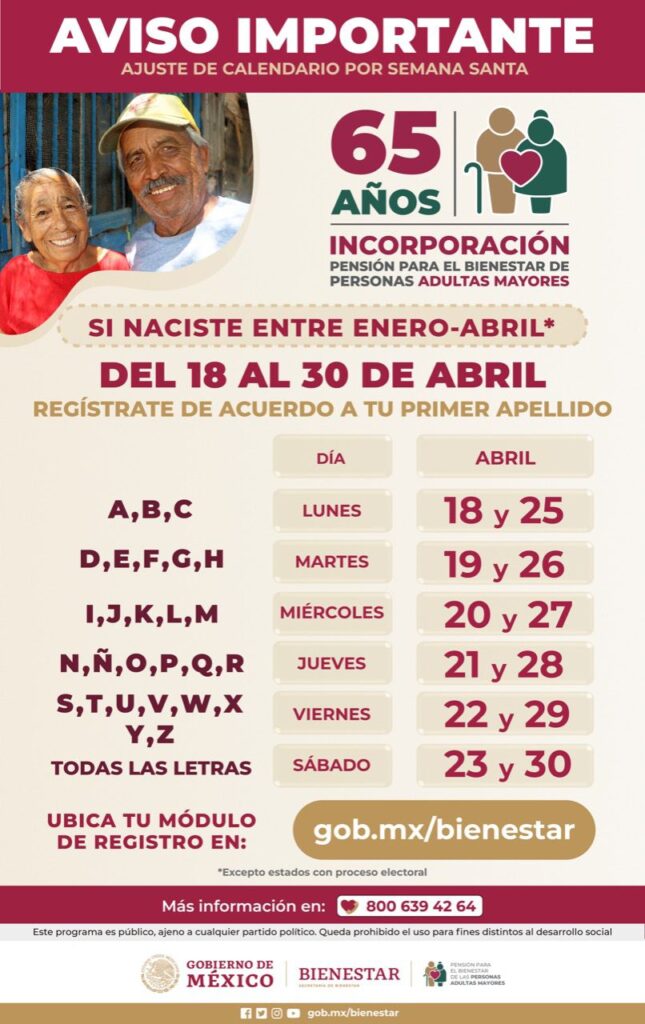 El 18 y 25 de abril podrán acudir aquellos adultos mayores que su apellido paterno inicie con A, B y C (Álvarez, Becerra, Campos), solo por mencionar algunos ejemplos.