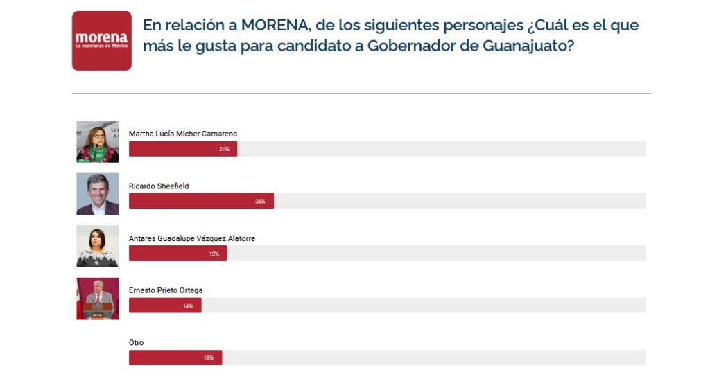 En el caso de Morena, el titular de Profeco, Ricardo Sheffield, se llevó las preferencias en este estudio con el 28%, mientras que la senadora Martha Lucía Micher Camarena, sumó las preferencias del 21 % Antares Vázquez con el 19%, y Ernesto Prieto Ortega con el 14%.