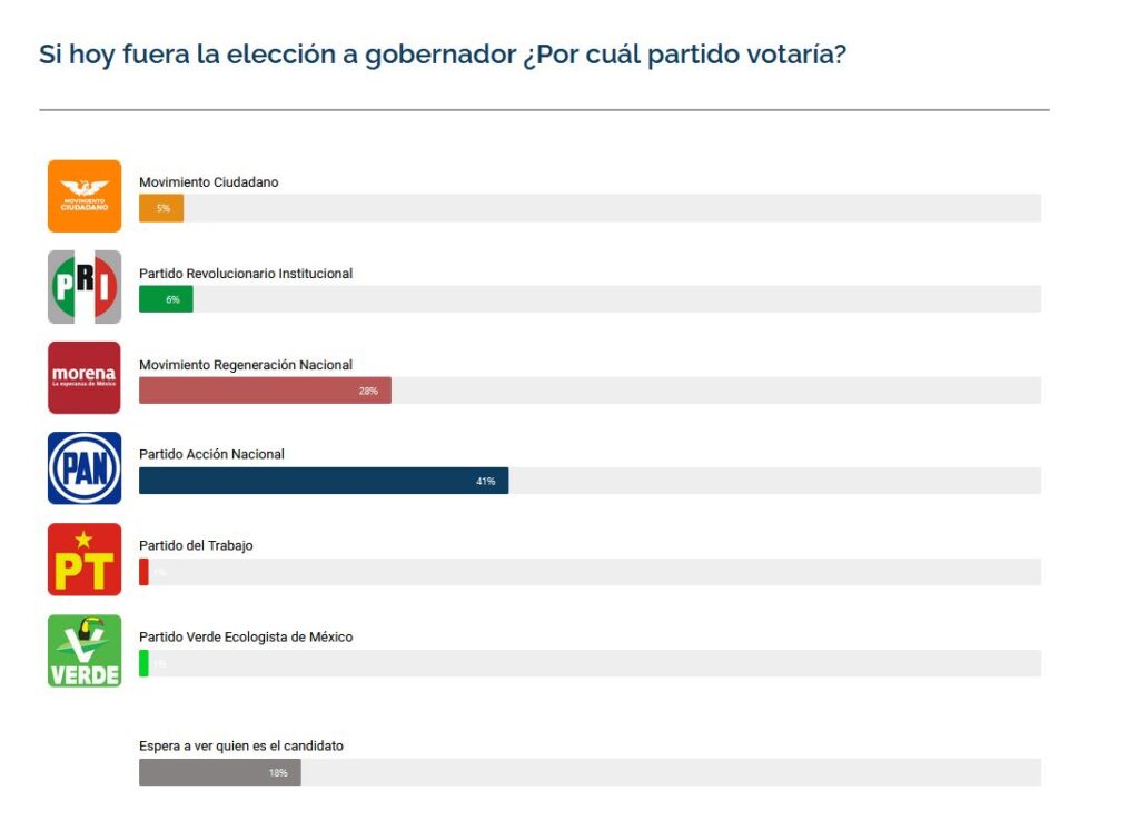 De acuerdo a los resultados de la encuesta de preferencias electorales rumbo a la gubernatura para el 2024, el PAN se llevó la ventaja con el 41% de la preferencia de los encuestados; seguido de Morena con el 28%, mientras que el PRI, tuvo el 6%; y Movimiento Ciudadano logró el 5%.
