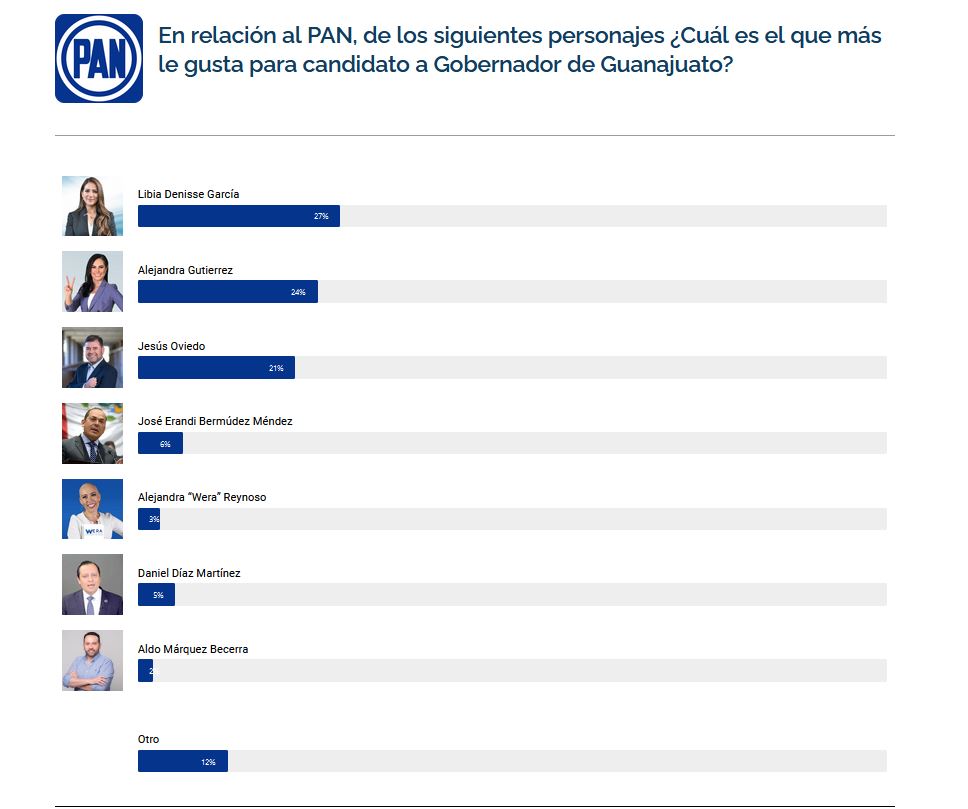 En relación con los personajes por cada partido político, en el caso del PAN, la hoy secretaria de gobierno, Libia Dennise García Muñoz Ledo, lideró las preferencias para ubicarse con el 27%; seguida de la alcaldesa de León, Alejandra Gutiérrez Campos, quien se llevó el 24% de las menciones.En tercera posición, dentro de los personajes del blanquiazul, la encuesta ubicó al titular de la Secretaría de Desarrollo Social y Humano (Sedeshu), Jesús Oviedo Herrrera (21%); luego Erándi Bermúdez (6%) seguidos de Alejandra la Wera Reynoso (3%); el secretario de Salud, Daniel Díaz Martínez (5%) y el hoy subsecretario de Sedeshu, Aldo Márquez Becerra (2%).