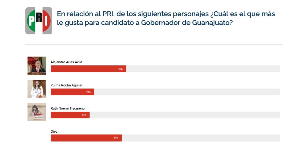 Y las respuestas fueron las siguientes:Ricardo Sheffield Padilla 28% MorenaYulma Rocha 13% PRILibia Dennise García 41% PANJuan Pablo Delgado 18% MCY en un segundo caso hipotético presentado, con personajes diferentes, los resultados se dieron de la siguiente manera:Ricardo Sheffield Padilla 28% MorenaRuth Tirscareño Aboites 13% PRIAlejandra Gutiérrez Campos 38% PANDessiré Ángel Rocha 21% MCEntre los resultados del estudio aplicado principalmente en ciudades del corredor industrial, arrojó que en alianza el PAN, PRI y PRD obtuvo el mismo porcentaje, que el PAN en solitario. En tanto, la alianza entre Morena, PVEM y PT, obtuvo el 31% de las preferencias.El documento arrojó que 6 de cada 10 guanajuatenses opinan que lo más conveniente es que el blanquiazul, vaya sin alianza; el resto dijo apoyaría la colaboración partidista.MEJZ*