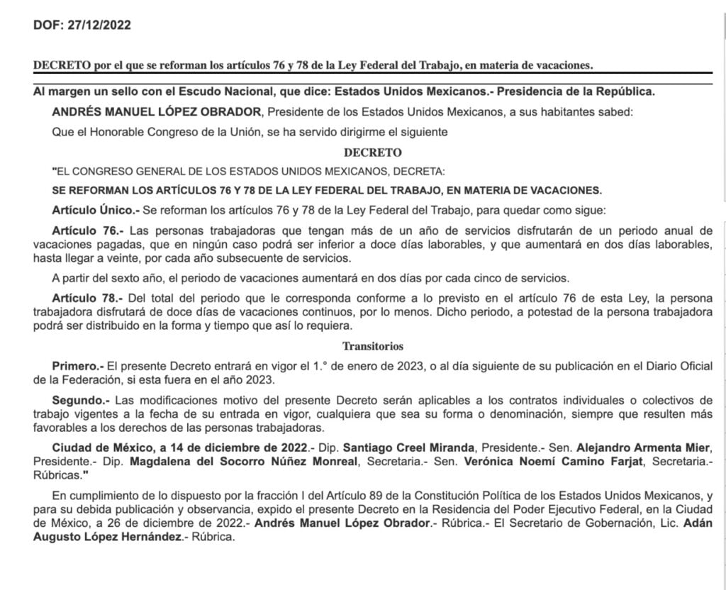 Este martes el Diario Oficial de la Federación publicó el Decreto por el que los trabajadores del sector privado tendrán derecho a 12 días continuos de vacaciones desde el primer año laborado.