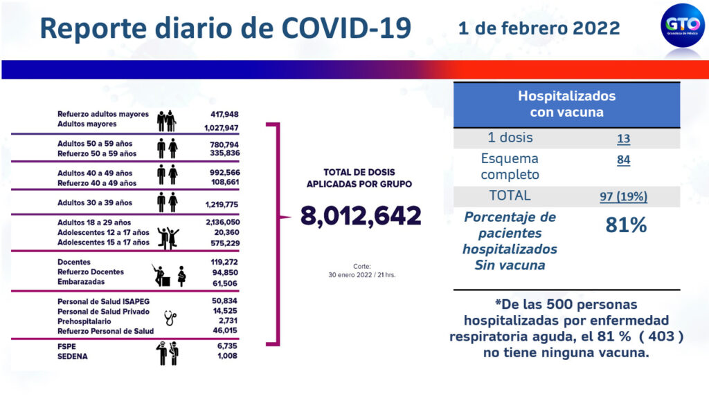 Al arranque del mes de febrero se tiene un acumulado de 500 pacientes hospitalizados de los cuales 112 están conectados a un ventilador; tan solo el Instituto de Salud Pública del Estado de Guanajuato registra 286 hospitalizados.En el estado hay 84 personas que cuentan con esquema de vacunación completo hospitalizadas, mientras que con esquema incompleto hay 13 pacientes bajo observación médica en nosocomios de la entidad.MEJZ*