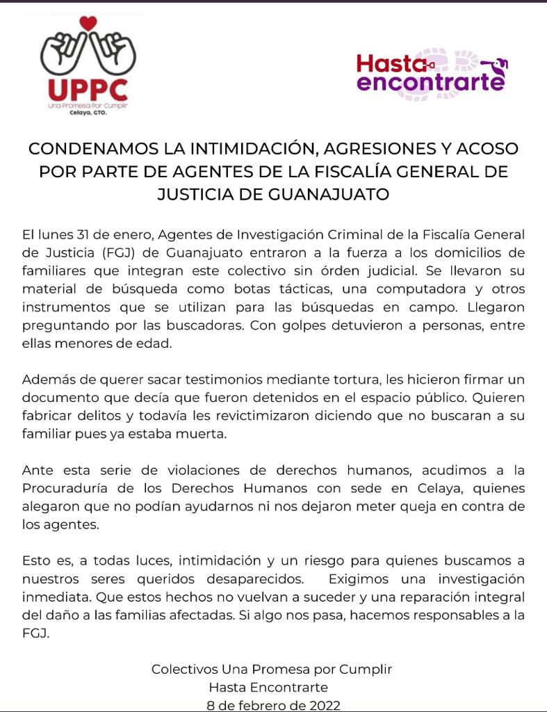 A través de sus redes sociales, los colectivos Una Promesa por cumplir y Hasta Encontrarte denunciaron que el pasado lunes 31 de enero agentes de Investigación Criminal entraron a la fuerza a los domicilios de familiares de integrantes de estos colectivos sin presentación previa de una orden judicial.