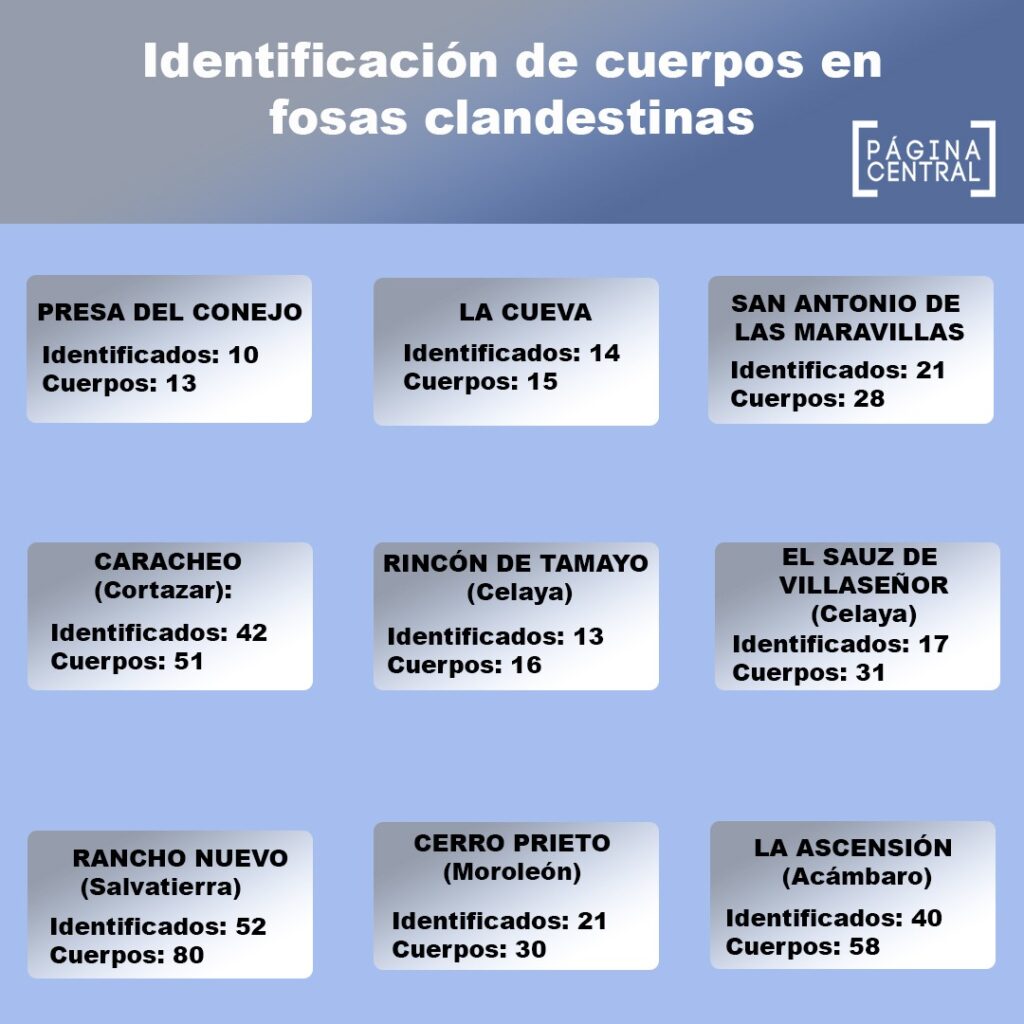 En total la base de datos de la Fiscalía General de Guanajuato arroja la recuperación de 322 cuerpos en fosas clandestinas, de los que han sido identificados 209.