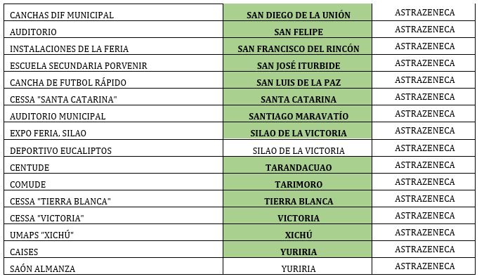 Los municipios en donde iniciará la aplicación de refuerzos para los treintañeros, será en Dolores Hidalgo, Guanajuato, San Diego de la Unión, San Felipe, Atarjea, Doctor Mora, San José Iturbide, San Luis de la Paz, Santa Catarina, Tierra Blanca, Victoria, Xichú, Celaya, Tarimoro, Coroneo, Tarandacuao, Santiago Maravatío, Jaral del Progreso, Salamanca, Yuriria, Cuerámaro, Huanímaro, Pénjamo, Pueblo Nuevo, León, San Francisco del Rincón, Silao, Romita y Cortazar.