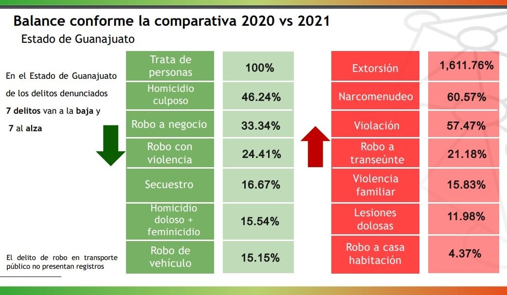 Guanajuato mantiene cifras al alza en otros delitos como extorsión con incrementos de mil 611.76 por ciento, al pasar de un año a otro del 0.28 a 4.79 mientras que León sufrió un incremento del 500% con incidencia del 0.063 al 0.38.