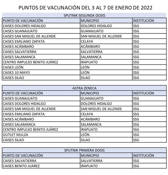En tanto, para segundas dosis a personas mayores de 18 años a quienes se hayan vacunado el antígeno Sputnik, podrán acudir a completar su cuadro de vacunación a los municipios de Dolores Hidalgo, Guanajuato, San Miguel de Allende, Celaya, Acámbaro, Salvatierra, Salamanca, Irapuato, León y Silao.