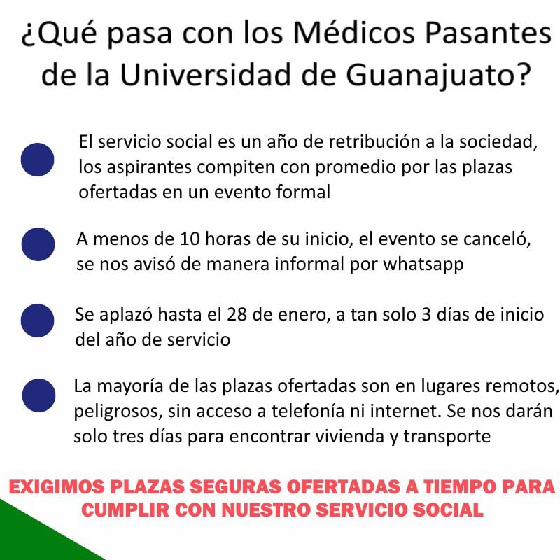“La lista de plazas que se nos ofertan son lejanas geográficamente, son conocidas peligrosas por aquellos compañeros que habitan cerca y por conocidas situaciones que atentaron contra la vida e integridad de pasantes previos”, expresaron.