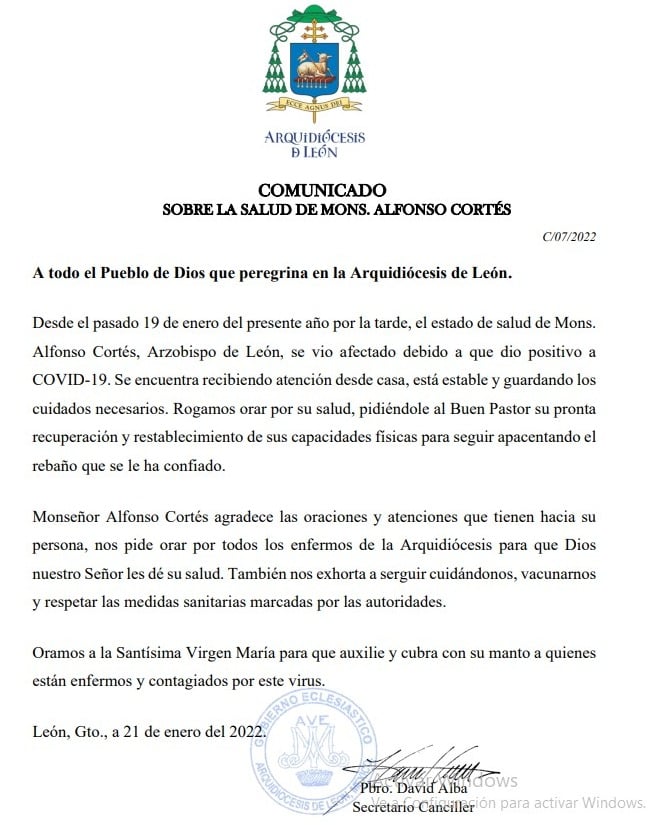 “Se encuentra recibiendo atención desde casa, está estable y guardando los cuidados necesarios”, informó el presbítero David Alba, secretario Canciller de la Arquidiócesis.