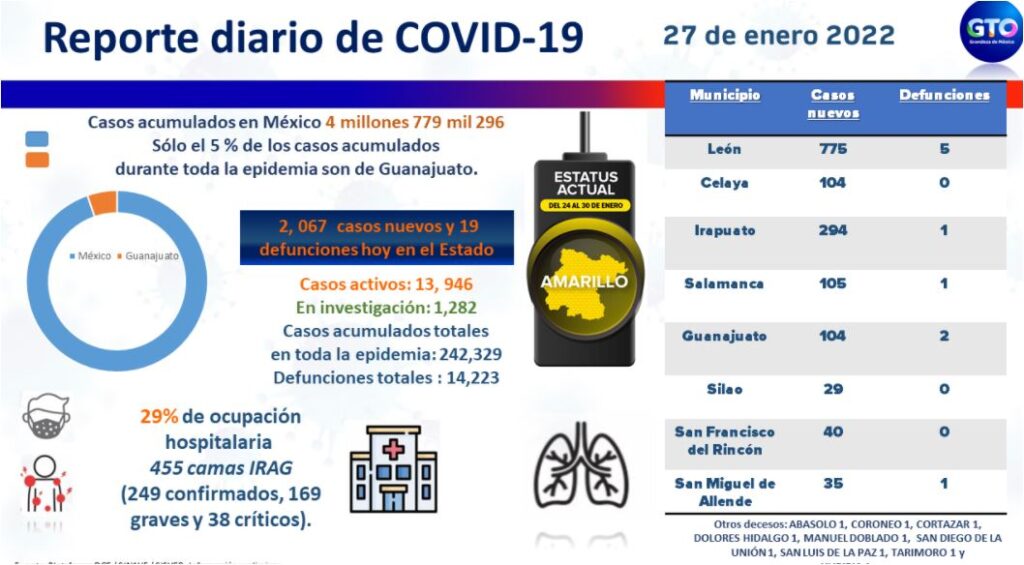 Tan solo en enero los contagios de SarsCov2 se quintuplicaron, según datos del secretario de Salud de Guanajuato, Daniel Díaz Martínez, quien afirmó que el 70% de las personas hospitalizadas por covid-19 fallece, principalmente por no estar vacunados.
