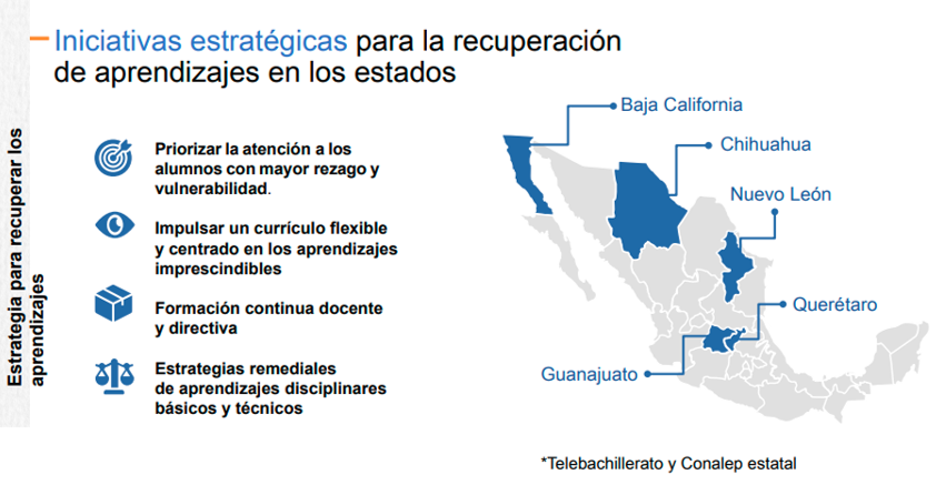 El estudio destaca también las iniciativas estratégicas para la recuperación de aprendizajes en los estados de Chihuahua, Baja California, Nuevo León y Querétaro, Guanajuato, al priorizar la atención a los alumnos con mayor rezago y vulnerabilidad, impulsar un currículo flexible y centrado en los aprendizajes imprescindibles, la formación continua docente y directiva; así como las estrategias remediales de aprendizajes disciplinares básicos y técnicos.