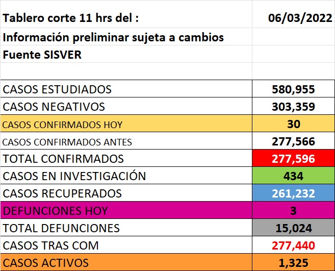 Desde que comenzó la pandemia, en toda la entidad se han registrado 277 mil 596 contados y 15 mil 024 defunciones por covid-19.
