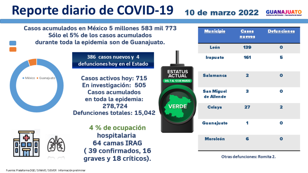 Este jueves se reportó el deceso de cuatro personas adultas mayores de entre 68 y 87 años, dos sí estaban vacunados; la Secretaría de Salud de Guanajuato (SSG) confirmó que las personas fallecidas tenían comorbilidades en su salud.Actualmente hay 39 personas hospitalizadas recibiendo atención médica especializada, cinco están estables, 16 graves y 18 en estado crítico e intubadas.