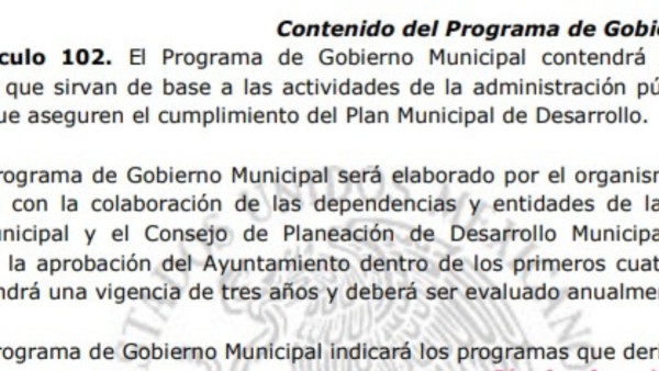 El artículo 102 de la ley orgánica municipal para el estado de Guanajuato, establece que El Programa de Gobierno Municipal contendrá los objetivos y estrategias que sirvan de base a las actividades de la administración pública municipal.