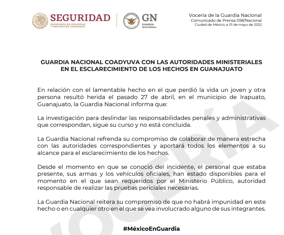 “La Guardia Nacional reitera su compromiso de que no habrá impunidad en este hecho o en cualquier otro en el que se vea involucrado alguno de sus integrantes”, aseguró la corporación.