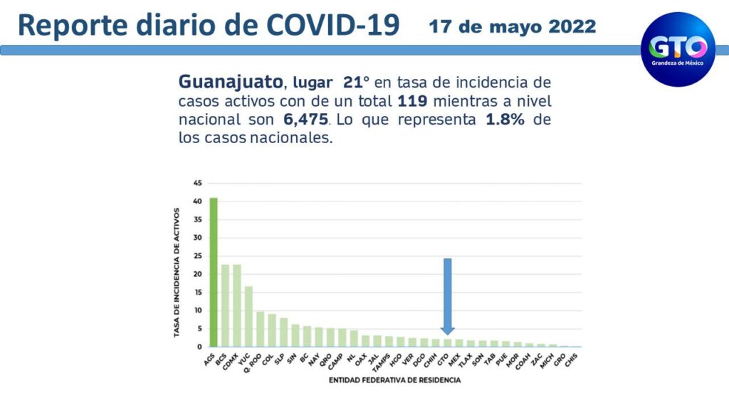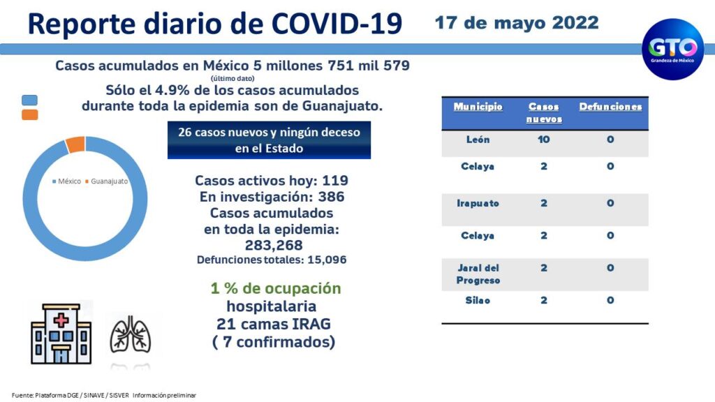 Acámbaro, Apaseo el Grande, Guanajuato, Pueblo Nuevo, Salamanca, San Luis de la Paz, San Miguel de Allende y Villagrán, reportaron un caso, para sumar un total de 26 nuevos contagios.