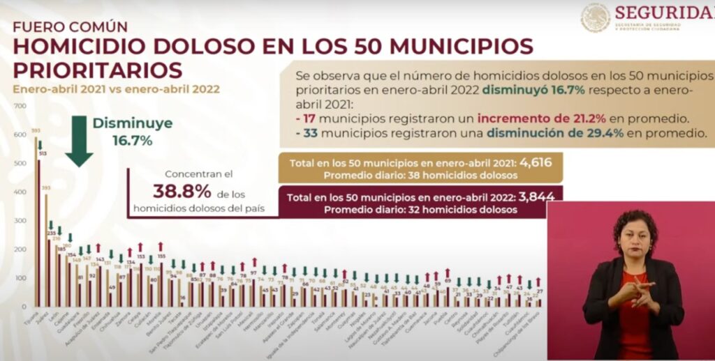 En el reporte general, Rodríguez Velázquez señaló que 17 de los 50 municipios registraron un aumento del 21.21% en promedio; y 33 ciudades disminuyeron 29.41 en promedio. De enero a abril de 2022 se tiene registro de 4 mil 616 homicidios dolosos.