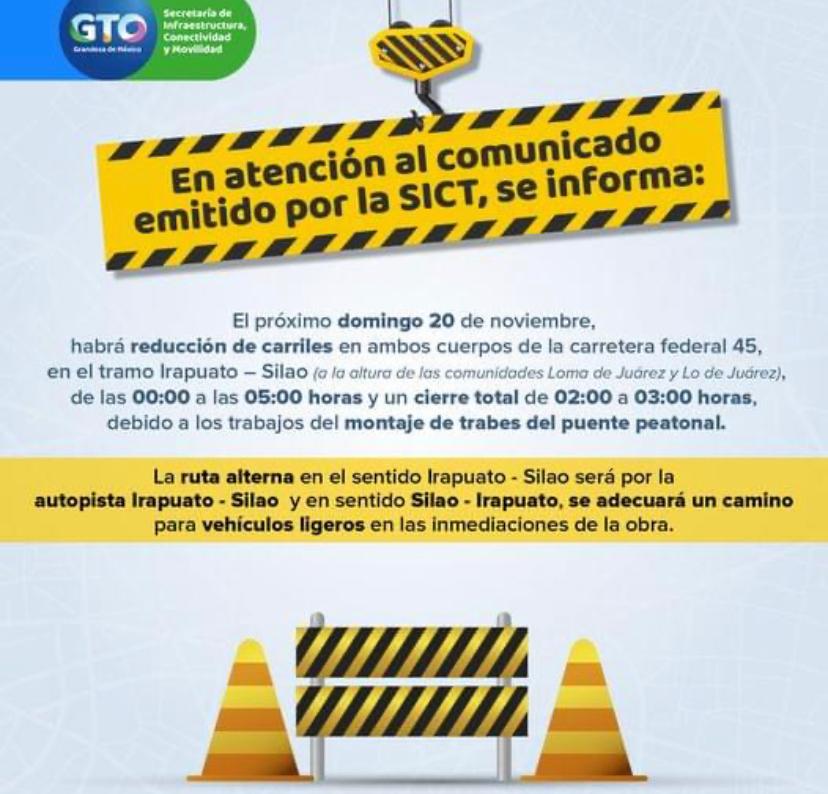 Derivado de estos trabajos, se cerrará la vialidad en el tramo carretero Irapuato- Silao de la carretera Querétaro- León, del kilómetro 123+000 al 126+000, principalmente para vehículos pesados.