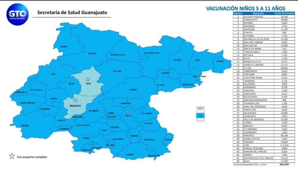 De acuerdo a un reporte de la Secretaria de Salud de Guanajuato con corte el 19 de septiembre se han aplicado 605 mil 594 dosis aplicadas, y con esquemas completos solo en los municipios de Irapuato, Celaya y Guanajuato capital; en el resto de los 43 municipios del estado lo hay sin vacuna y sin esquema completo.