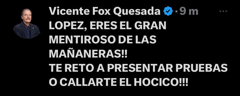 En respuesta, el expresidente guanajuatense explotó en sus redes sociales a través de las que señaló “Lopez (SIC) eres el gran mentiroso de las mañaneras¡¡¡ Te reto a presentar pruebas o callarte el hocico”.
