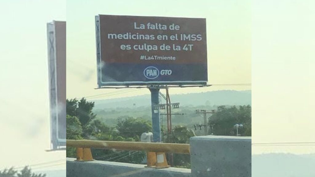 Y como en un acto de respuesta del blanquiazul, a la altura del municipio de Irapuato, los automovilistas pueden observar uno firmado por el Partido Acción Nacional (PAN) que dice: ‘La falta de medicinas en el IMSS es culpa de la 4T’.