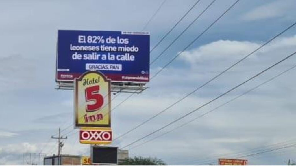 En la ciudad de León hay otro espectacular ubicado sobre el bulevar aeropuerto, en la salida de la ciudad rumbo a Silao, que hace referencia al tema de inseguridad: ‘En 10 años, los homicidios aumentaron 577% en Guanajuato. Gracias PAN’ y uno más con la leyenda, ‘El 82% de los leoneses tienen miedo de salir a la calle. Gracias PAN’; ‘Guanajuato, el estado más peligroso para ser policía’, y otros temas referentes a la pobreza, salarios y mujeres.