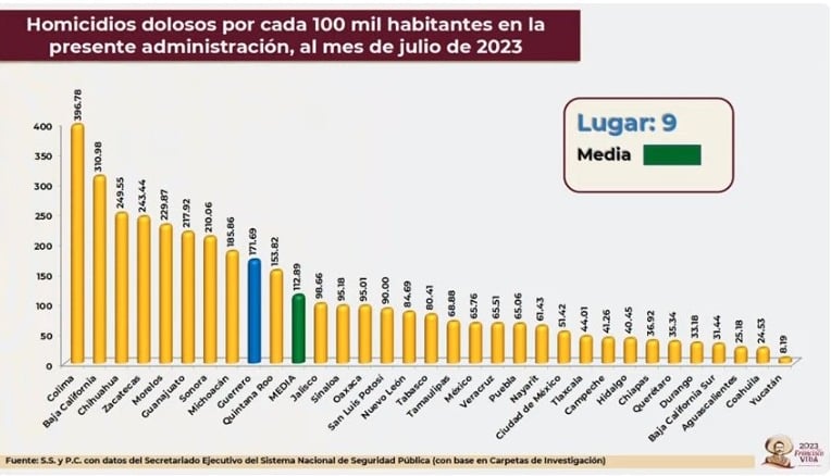 Pese a que Colima registra 396.78 muertes violentas por cada cien mil habitantes, Baja California 310.98 y Chihuahua 249.55, el jefe del Ejecutivo federal optó por comparar la violencia que se vive en Guanajuato y la de Guerrero en cuanto a homicidios dolosos.