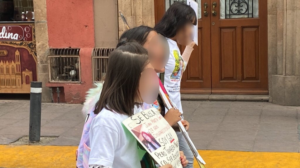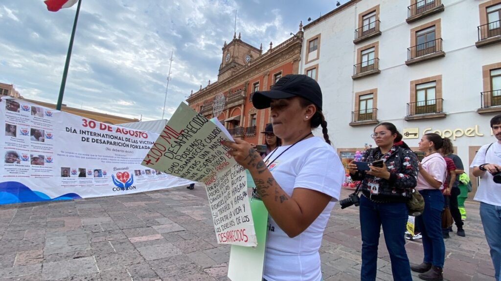 Carga un cartel con su ficha de desaparición, y camina sobre la calle Madero mostrándolo, es el primer año que se manifiesta buscando justicia con otras 50 personas del Colectivo Buscando con el Corazón, en León.