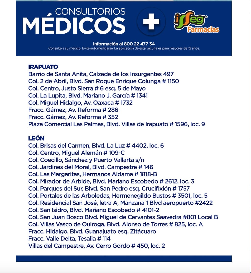 Pfizer desde el pasado 27 de diciembre, en 15 de sus sucursales en las que cuentan con consultorio médico. También hay disponible en el municipio de