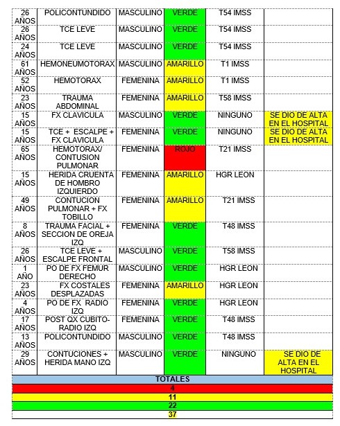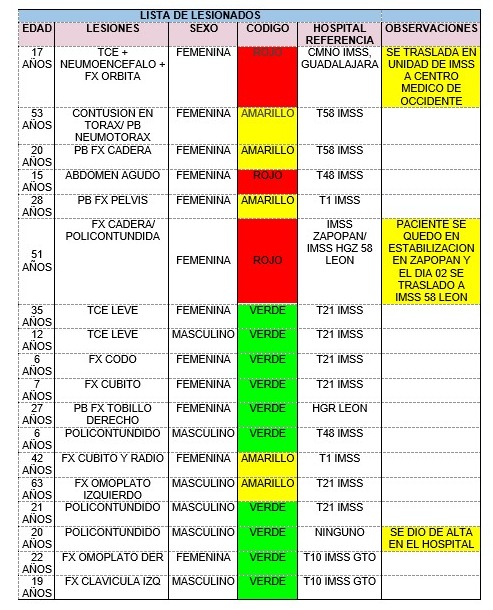 De acuerdo a información proporcionada por autoridades de la Secretaría de Salud de Guanajuato (SSG), con corte a las 16:00 horas, se informó que los pacientes dados de alta son tres hombres de 15, 20 y 29 años, así como una joven de 15 años, quienes registraban policontusiones, heridas leves y lesiones en clavícula.
