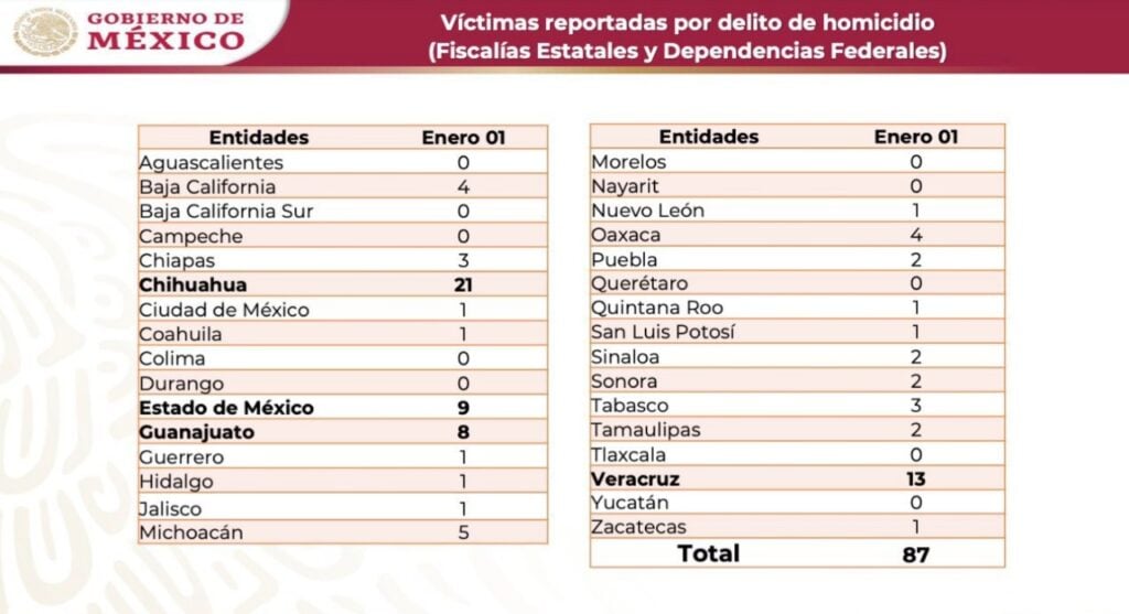 De las 87 personas asesinadas el primer día del año 21 de ellas corresponden a Chihuahua, donde se registró un motín en el Cereso del cual se fugaron reclusos y, resultado de ello, fallecieron 10 custodios y 7 internos.