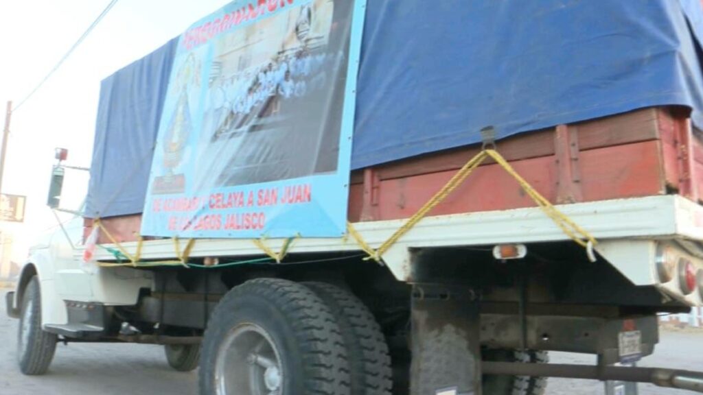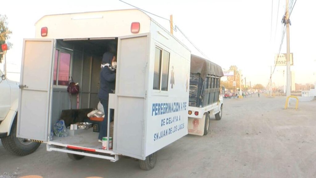 Un remolque les adelanta el paso para abastecerlos de alimentos y a la orden por cualquier emergencia. Son peregrinos que vienen caminando desde Acámbaro y Celaya, con destino a San Juan de Los Lagos.