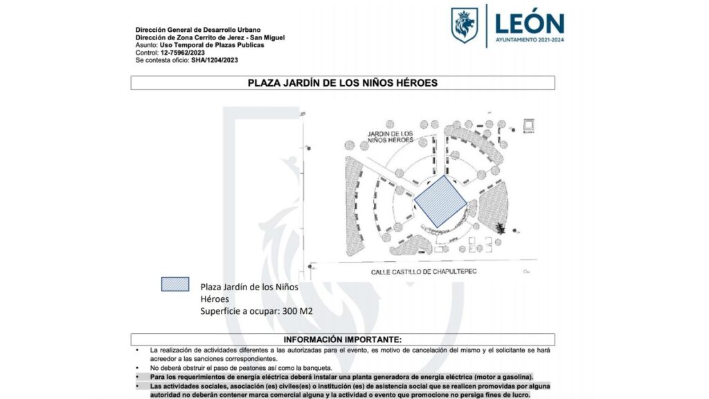 De acuerdo a información proporcionada por el área de Comunicación Social de la Dirección General de Desarrollo Urbano de León, la negativa derivó porque los espacios solicitados estaban apartados con anticipación. Por ello, se ofreció el jardín Niños Héroes.
