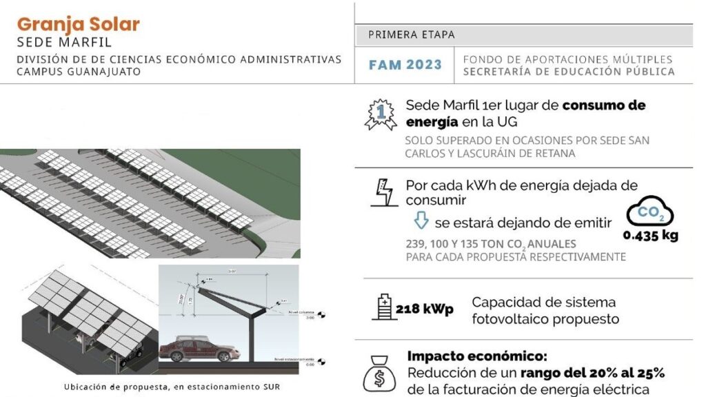Dará inicio en la Universidad de Guanajuato (UG) la primera etapa de construcción de una Granja Solar en la División de Ciencias Económico Administrativas (DCEA), Sede Marfil del Campus Guanajuato, con el objetivo de obtener una sustentabilidad energética y la disminución de la huella de carbono.
