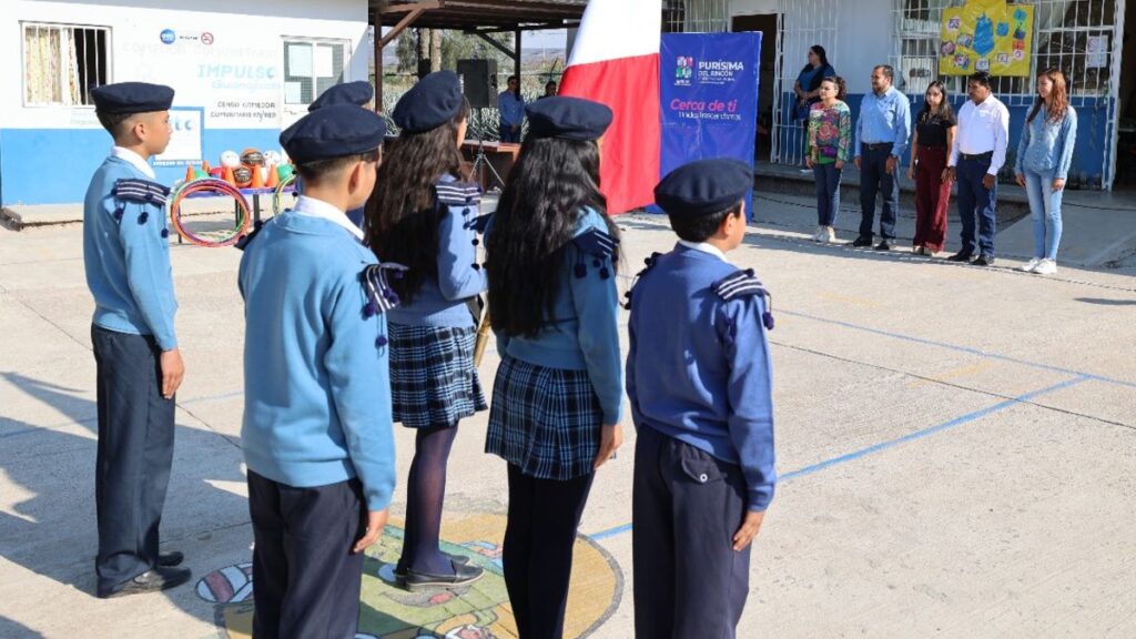 La mañana de este lunes, Roberto García Urbano, alcalde de Purísima del Rincón acompañado de funcionarios públicos, encabezaron los honores a La Bandera en la primaria José Guadalupe Rocha Arias, además de vivir un encuentro deportivo en el vaivén de la pelota con un partido de voleibol.