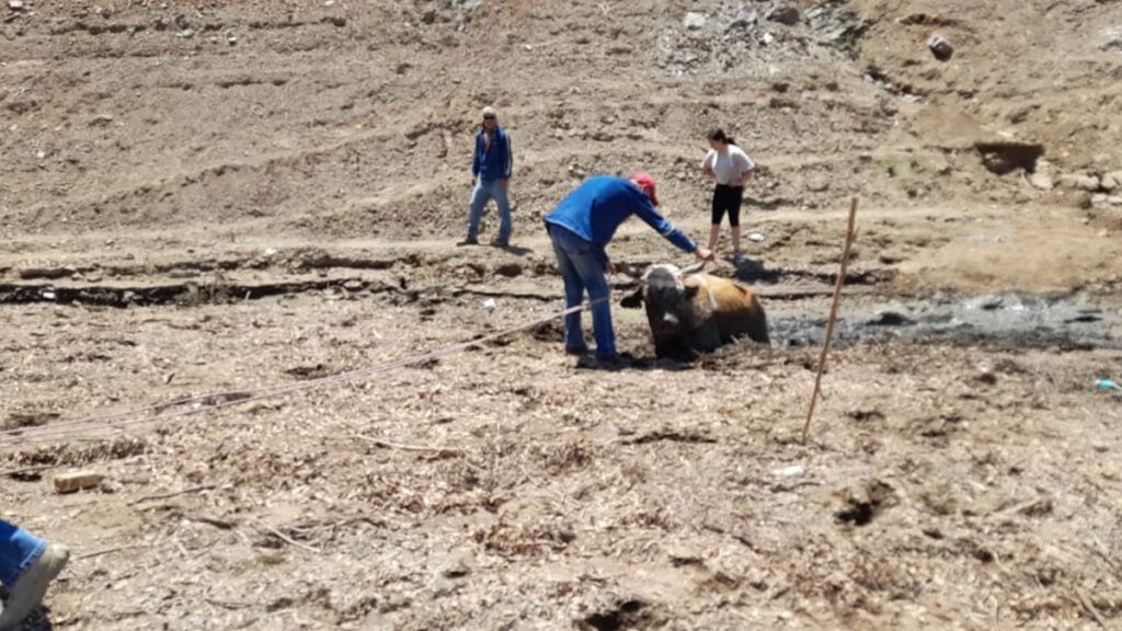 Personal del gobierno municipal de Guanajuato e integrantes de la agrupación animalista Tlacuatzin Rescue, rescataron a un ejemplar macho de ganado vacuno que no podía salir de un vado, cerca de la Presa de Mata.
